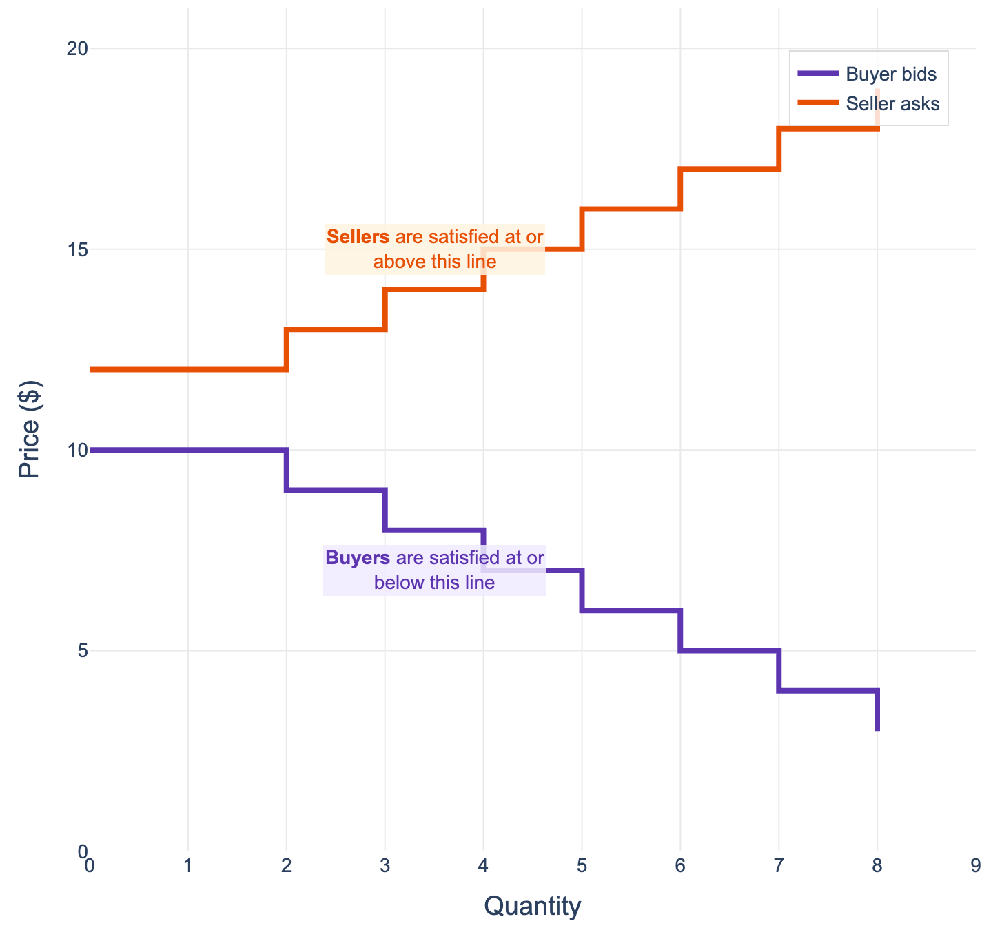 The real stock market (say, the NYSE) sometimes uses a different system which doesn’t reward reaction times nearly as highly. Before market open and close, a call auction is used to decide on the first and last trade to execute for the day. The object of which is to execute a block of trades at a single price, to produce a definite start/close point for the market to continue from.